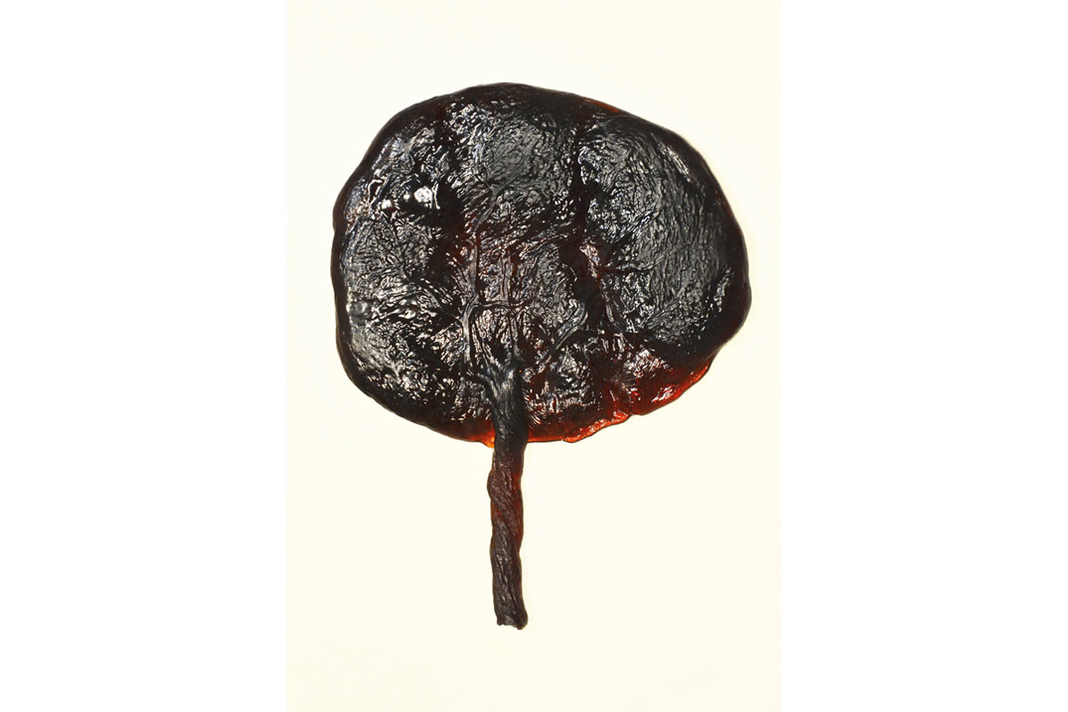At the birth of our child, the custom at the hospital was that the father cut the umbilical cord, and then the mother gave birth to the placenta, which the doctor examined and presented to the parents before discarding it to be incinerated as hazardous waste. All this goes to show that this organ of intermediation, the tangible and symbolic evidence of our interconnectedness, has no place in modern life. Opposing the custom, we asked that the placenta not be thrown away. After receiving it, I used it to make direct prints and then I preserved it by freezing. Later, I prepared a mother mold of the organ, which I used for making a cast of colophony. My analogy is the tree, where the roots represent the main, secondary and capillary vessels, the trunk is the umbilical cord, and the crown is the fetus. As it is a kind of resin, colophony is the blood of the tree. This analogy may help understand why people are so deeply attached to trees on an emotional and spiritual level. Our very first sensory relationship is established with a vital organ that has a very similar structure to a tree. My mother planted a sycamore sapling in their garden on top of the placenta of our son.